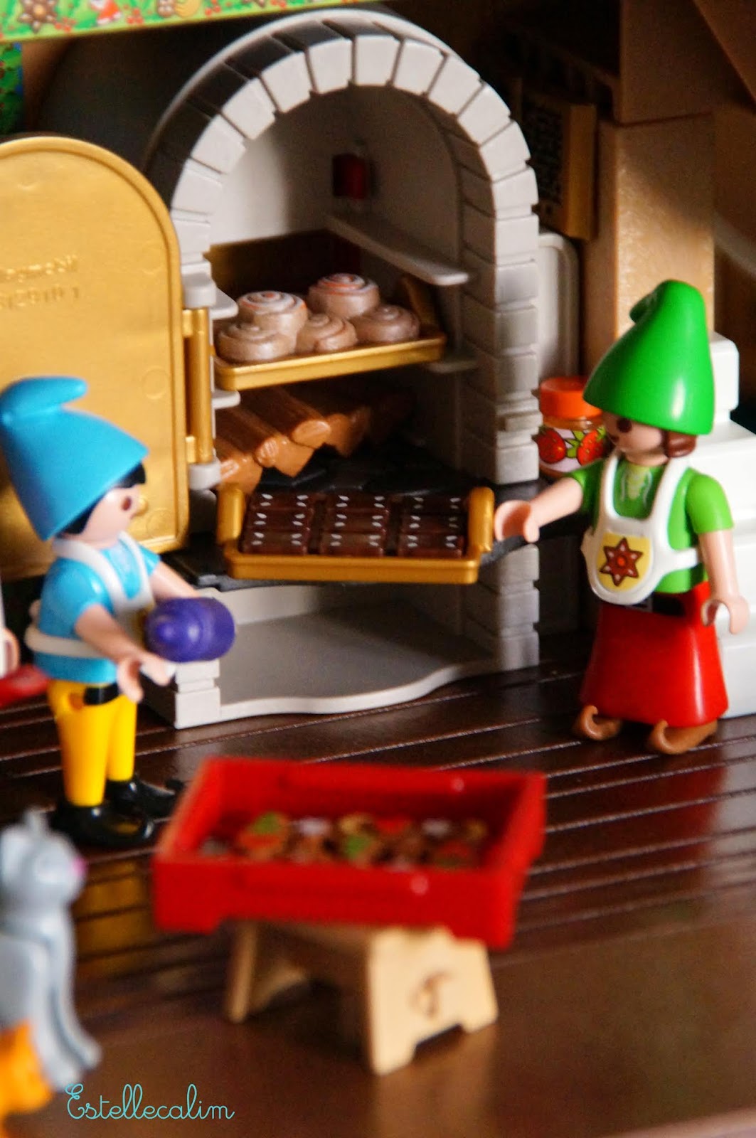 C'est très soigné, avec plein d'accessoires, et sur le toit, il y a 3 emporte-pièces pour faire des sablés avec une empreinte de visage Playmobil dans la cheminée.